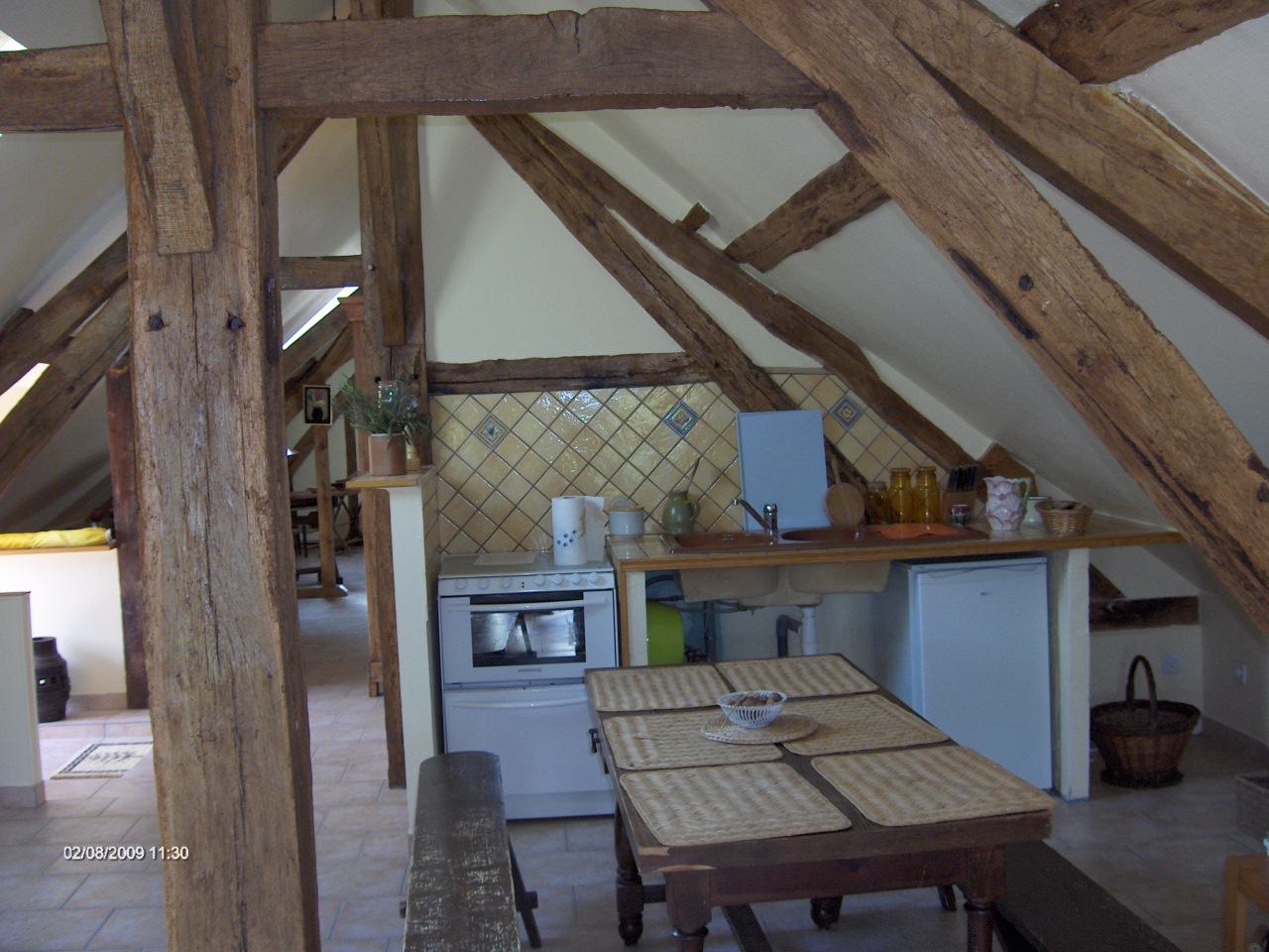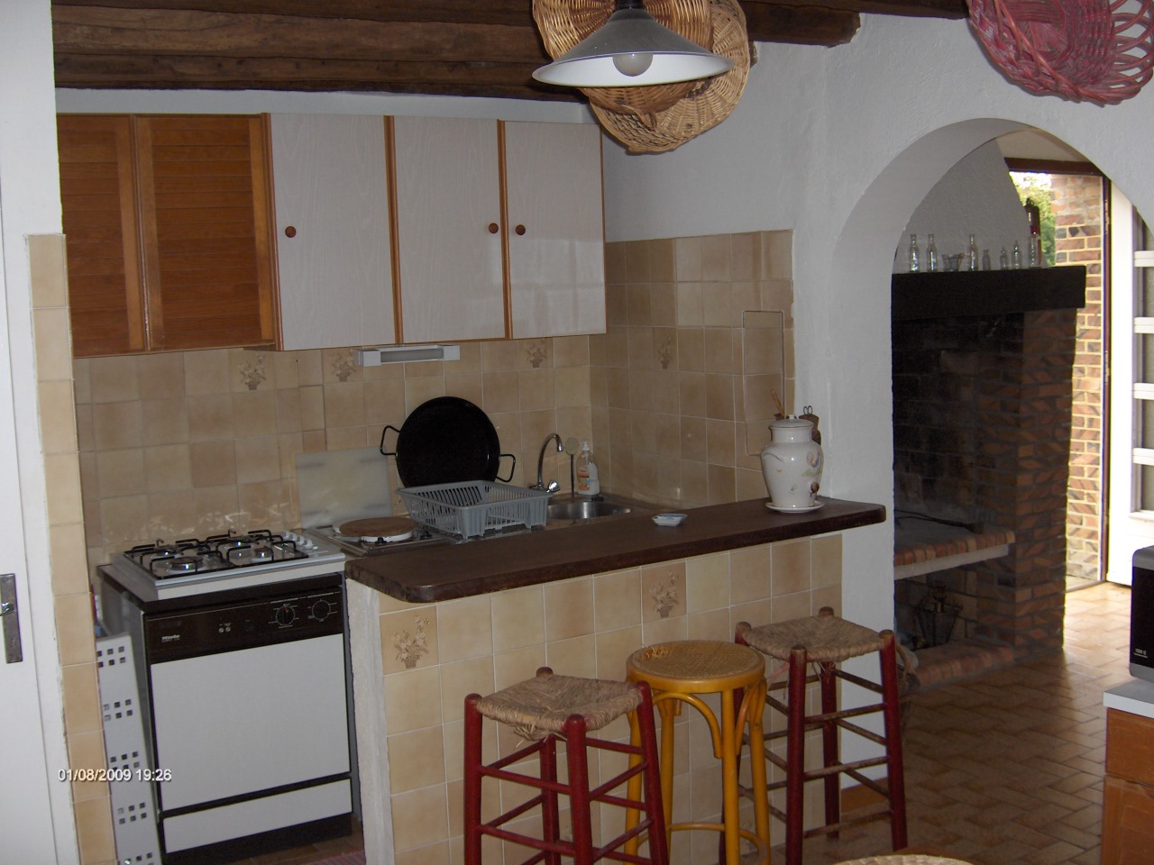 cuisine équipée d'un lave vaisselle et d'un micro onde, salle à manger avec cheminée,